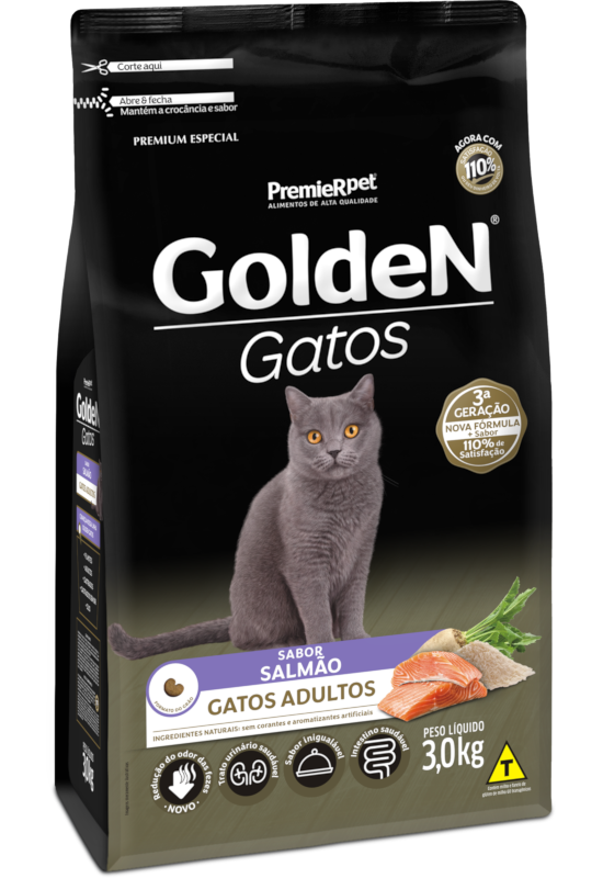 GoldeN® Gatos Adultos Salmão Formulada com ingredientes de alta qualidade e balanceada para suprir às particularidades nutricionais dos felinos, GoldeN® Gatos Adultos Salmão oferece sabor irresistível e cuidados especiais com o trato urinário, garantindo assim, sabor e saúde para seu gato. 1kg e 3kg – Sistema de Fechamento – Easy open / Abre Fecha e 10,1kg.