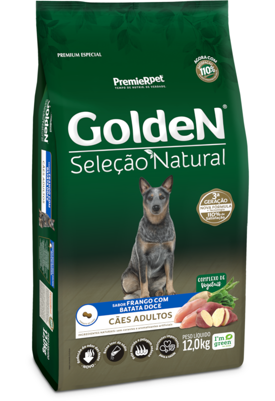 GoldeN® Seleção Natural Cães Adultos Frango & Batata-doce Atenta às tendências do mercado e exigências dos nossos clientes, a linha GoldeN® Seleção Natural, pertencente ao segmento Premium Especial, foi desenvolvida a partir de uma rigorosa seleção e controle de matérias-primas, além de ser formulada com ingredientes exclusivos. GoldeN® Seleção Natural Cães Adultos Sabor Frango com Batata Doce contém nutrientes importantes para a saúde, como fontes de fibras e sais minerais e possui baixo teor de sódio para ressaltar o sabor natural dos ingredientes. Além disso, traz um equilíbrio de ômegas e minerais para uma pele nutrida e pelagem sedosa, redução do odor das fezes por meio de ingredientes especiais e é livre de corantes, aromatizantes artificiais e ingredientes transgênicos. GoldeN® Seleção Natural, saudável como seu estilo de vida.