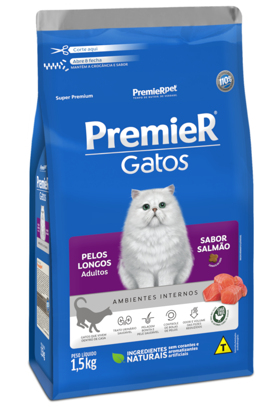 PremieR® Gatos Pelos Longos Adultos Salmão PremieR® Gatos Adultos Pelos Longos – Salmão oferece ao seu gato adulto de pelos longos um cuidado especial todos os dias. Através de uma combinação de ingredientes nobres, realça a beleza da pelagem, tornando-a exuberante e macia. No entanto, esses pelos densos podem predispor à formação das “bolas de pelos”, essas são resultado do acúmulo de pelos no trato digestivo pelo hábito de se lamber dos felinos. PremieR® Gatos Adultos Pelos Longos – Salmão traz em sua fórmula fibras selecionadas como a aveia e polpa de beterraba que previnem a formação dessas indesejáveis “bolas de pelos”. 0,5 Kg / 1,5 Kg – Sistema de Fechamento – Easy open / Abre Fecha e 7,5 Kg